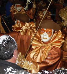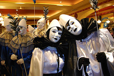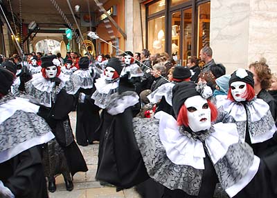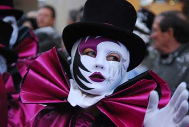 often based on the traditional Limoux version (Black with brilliant shiny bands). Pierrots wear a curious expressionless face mask.