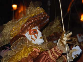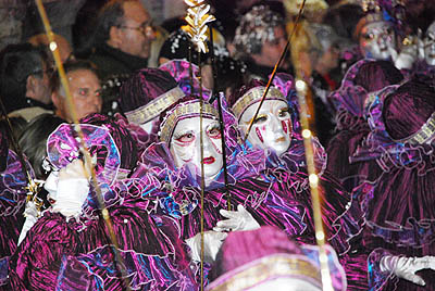 They burn for a full 2 hours. By their light the Pierrots process, slowly moving their Carabénas and distributing confetti.