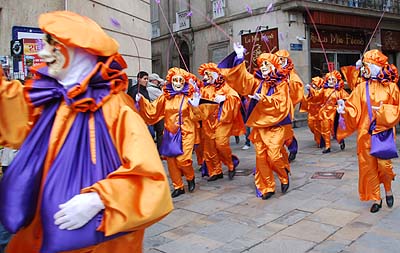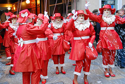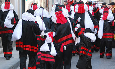 It starts with a parade of the organising committee dressed up in comic masks, white baggy shirts and trousers, wearing red scarves and clogs, and carrying whips.