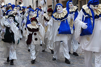 Each Bande consists of a group of masked Pierrots and their accompanying musicians who follow the Pierrots from one café to another on the Place, playing as they walk,