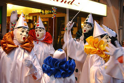 Pierrots stop and speak to people. Their conversations or Chines also generally end in the distribution of confetti, scattered over heads,
