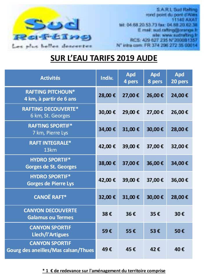 Sud Rafting at Axat. - (Please check the current prices by visiting their web-site as these prices are out of date)