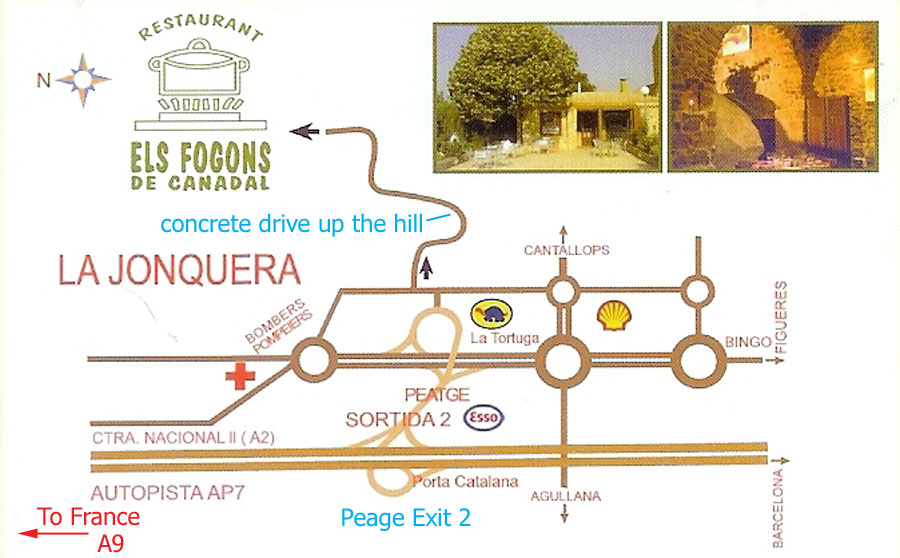 If you are looking for some truly excellent fish and seafood it may come a bit of a surprise to find that in La Jonquera there is one that fits the bill perfectly. Away from the hustle and bustle of this frontier town, Els Fogons de Canadal looks out across the valley from it's hilltop position and unless you make a concerted effort to see La Jonquera it has dissapeared from view. It is not easy to find or get to but it really is worth the effort. The plan below is a rough guide to how to get there. Sortida 2 (exit 2) on the Toll Road/Peage is also described as La Jonquera South. Follow the route shown on the plan and you will find yourself behind some industrial units. Watch out for vehicles manovering! You will find a concrete drive leading up the very steep hill that has been installed by the owners of the restaurant. When you reach the top you will get fantastic views across the Costa Blanca plain to the Pyrenees and no hint of La Jonquera. There is plentiful parking. La Jonquera is 1.25 hours from Carcassonne and 20 minutes from Soredè The restaurant is a delight set amongst the walls of this small castle it has open terraces for eating outdoors and a large air-conditioned restaurant for when it gets too hot. The food is exceptional and a three course 'Plat de Jour' will set you back about €20.00 including wine. Fancy something more expensive well that can be taken care of too by selecting from the catch of the day. The staff are pleasant, friendly, efficient and speak in many languages. In summary do not miss out on a visit to this restaurant even if it's only for a drink on the terrace and to take in the views. It is open all day and since the Spanish have no fixed time for lunch you can turn up at 2.30 and still be served, in fact this is when it gets busy with the local families. Unmissable! ![]()